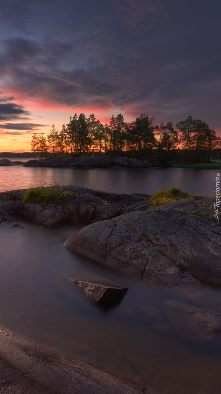 Edytor tapety: Skały i drzewa na jeziorze Onega
