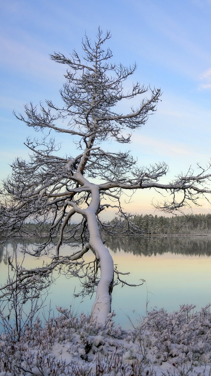 Edytor tapety: Ośnieżone drzewo pochylone nad jeziorem