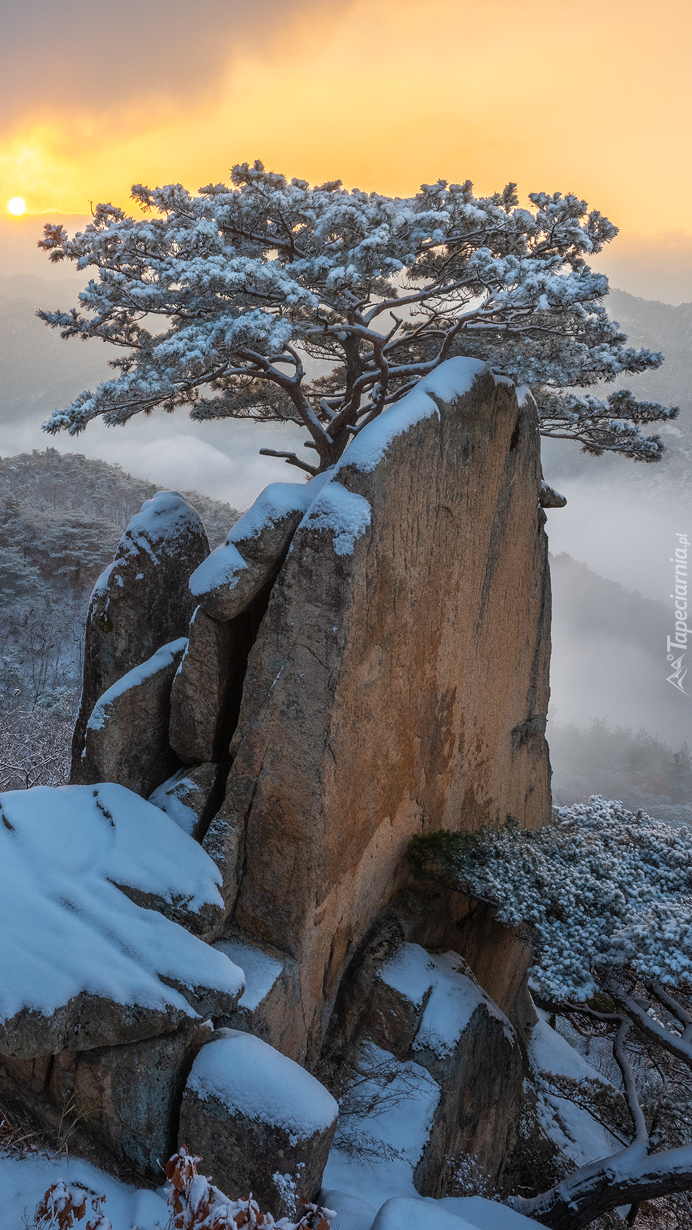 Edytor tapety: Ośnieżone drzewo na skale