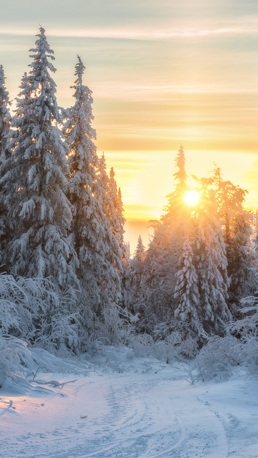Edytor tapety: Promienie słońca nad ośnieżonymi świerkami