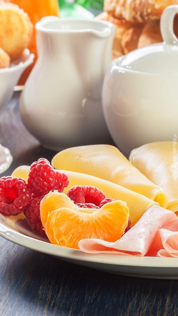 Edytor tapety: Mandarynki i maliny obok sera żółtego