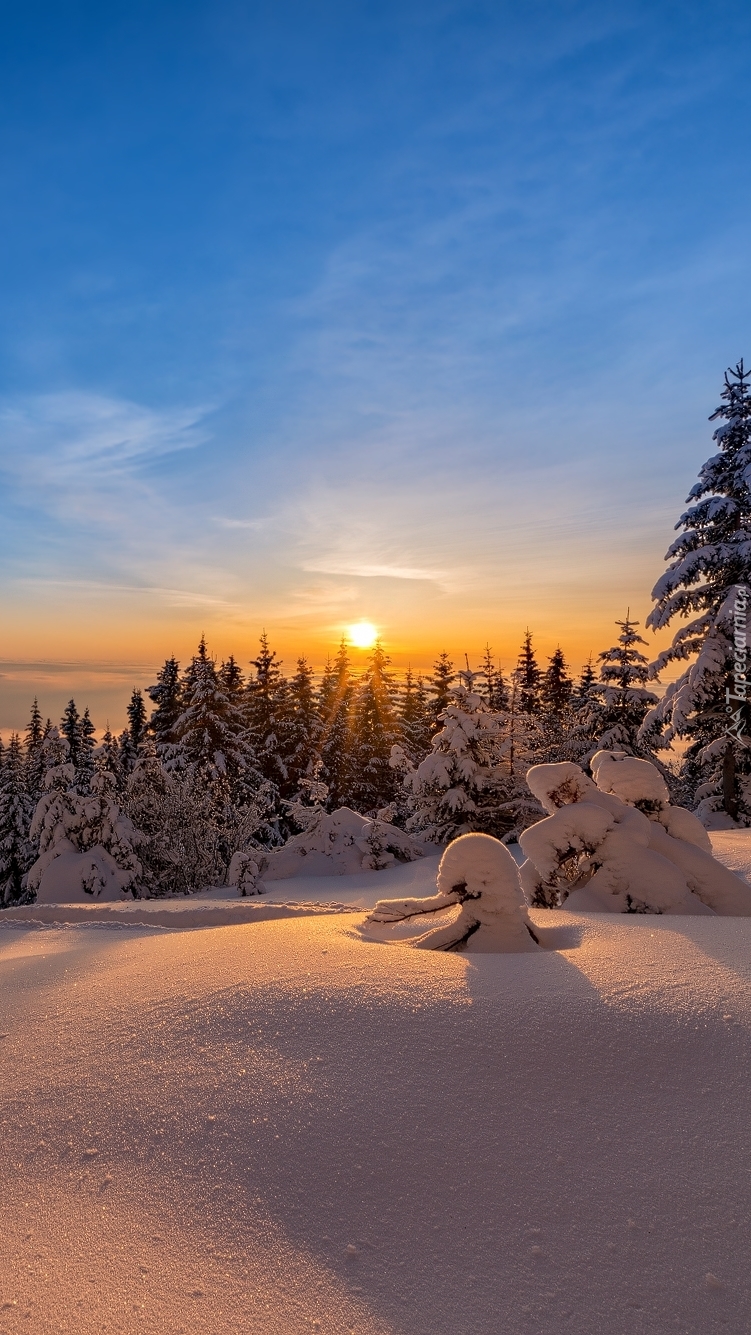 Edytor tapety: Zachód słońca nad ośnieżonymi świerkami