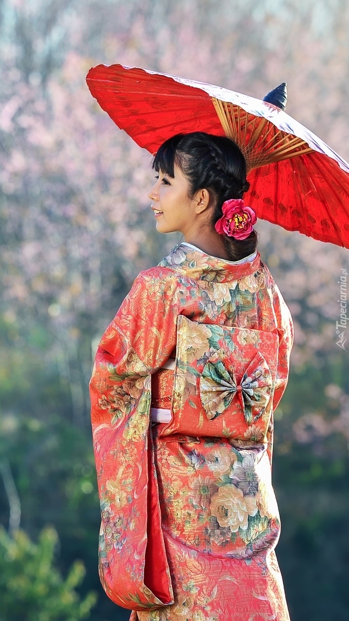 Edytor tapety: Azjatka w kimono pod czerwoną parasolką