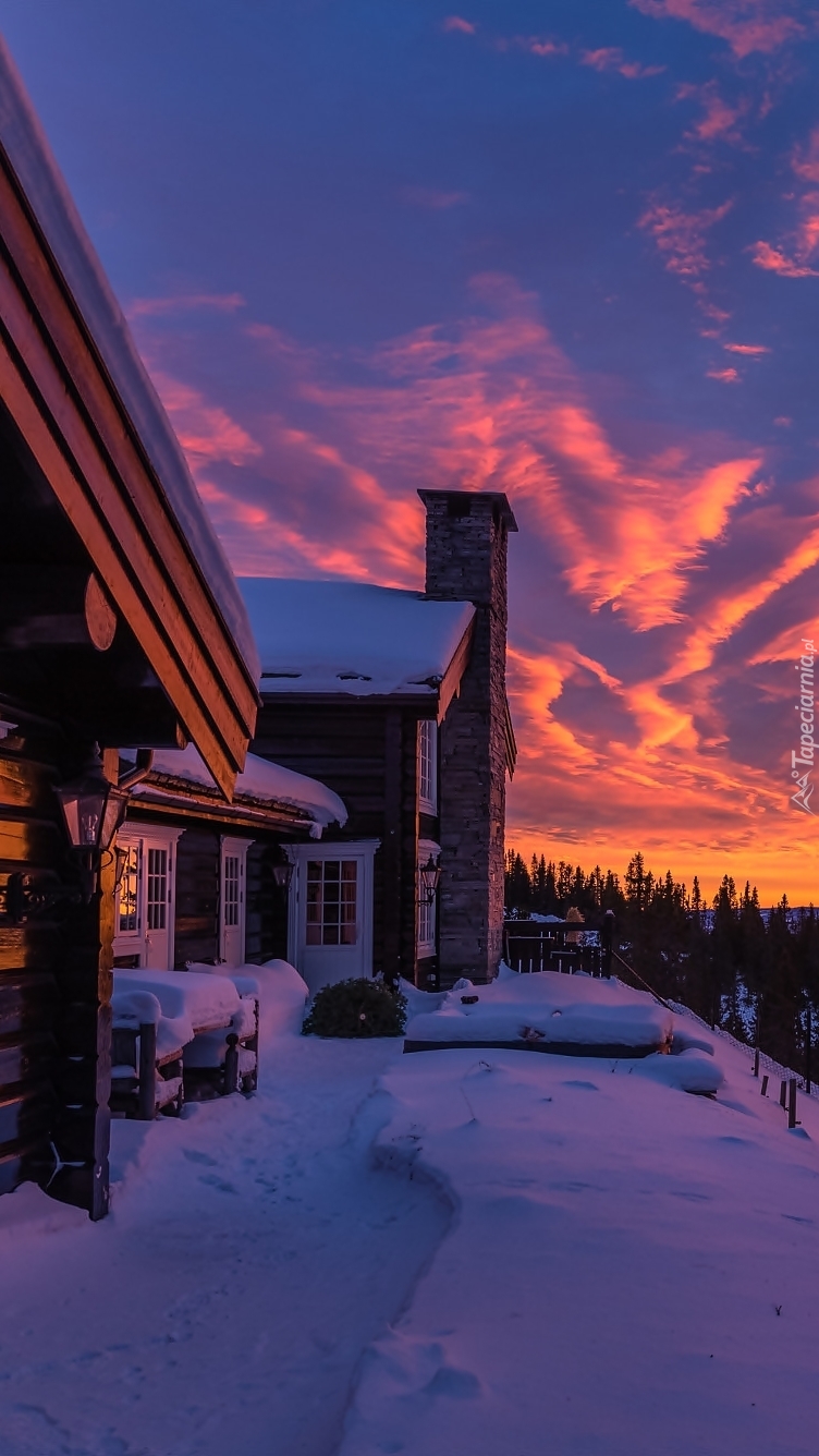 Edytor tapety: Ośnieżony dom o zachodzie słońca