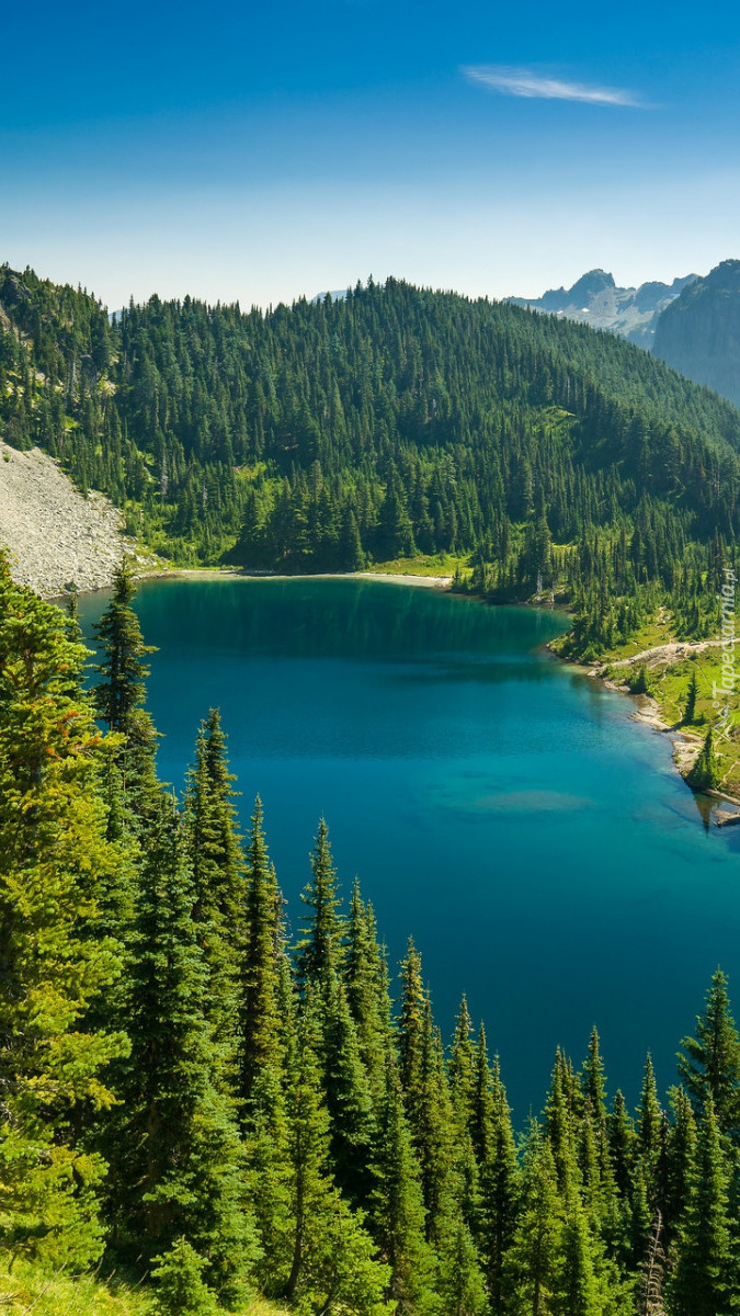 Edytor tapety: Świerki dookoła jeziora
