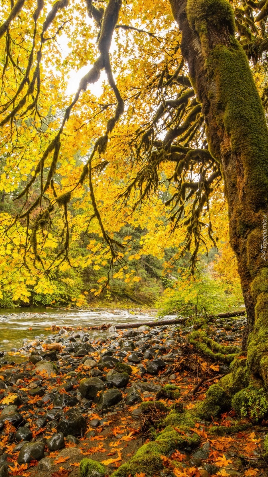 Edytor tapety: Omszałe drzewo pochylone nad rzeką