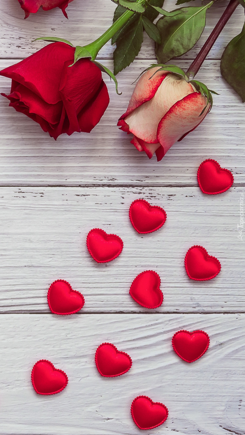 Edytor tapety: Dwie róże z serduszkami na deskach