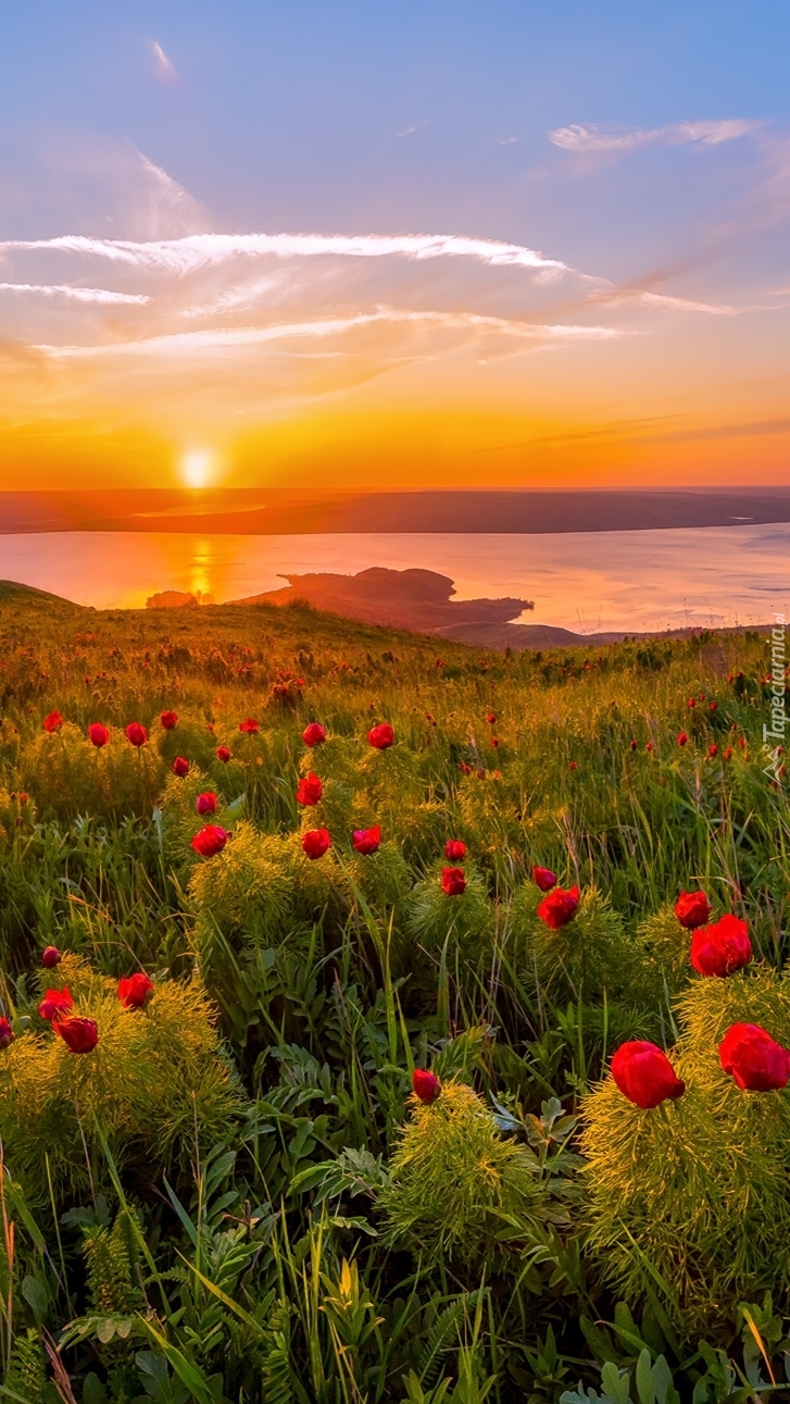 Edytor tapety: Piwonie w promieniach wschodzącego słońca