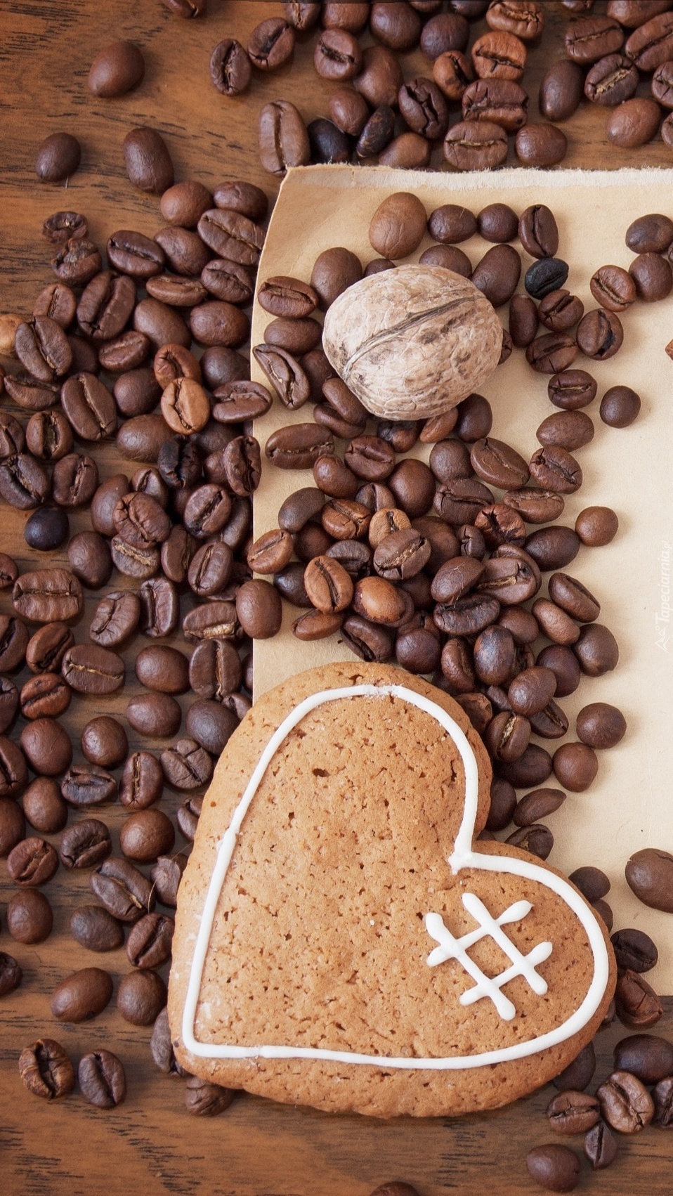 Edytor tapety: Serce z piernika wśród ziaren kawy