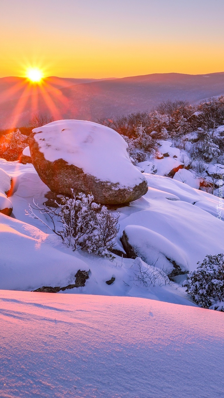 Edytor tapety: Ośnieżony głaz o wschodzie słońca