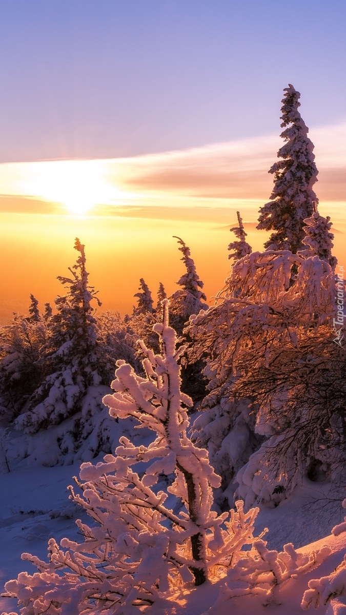 Edytor tapety: Wschód słońca nad ośnieżonym lasem