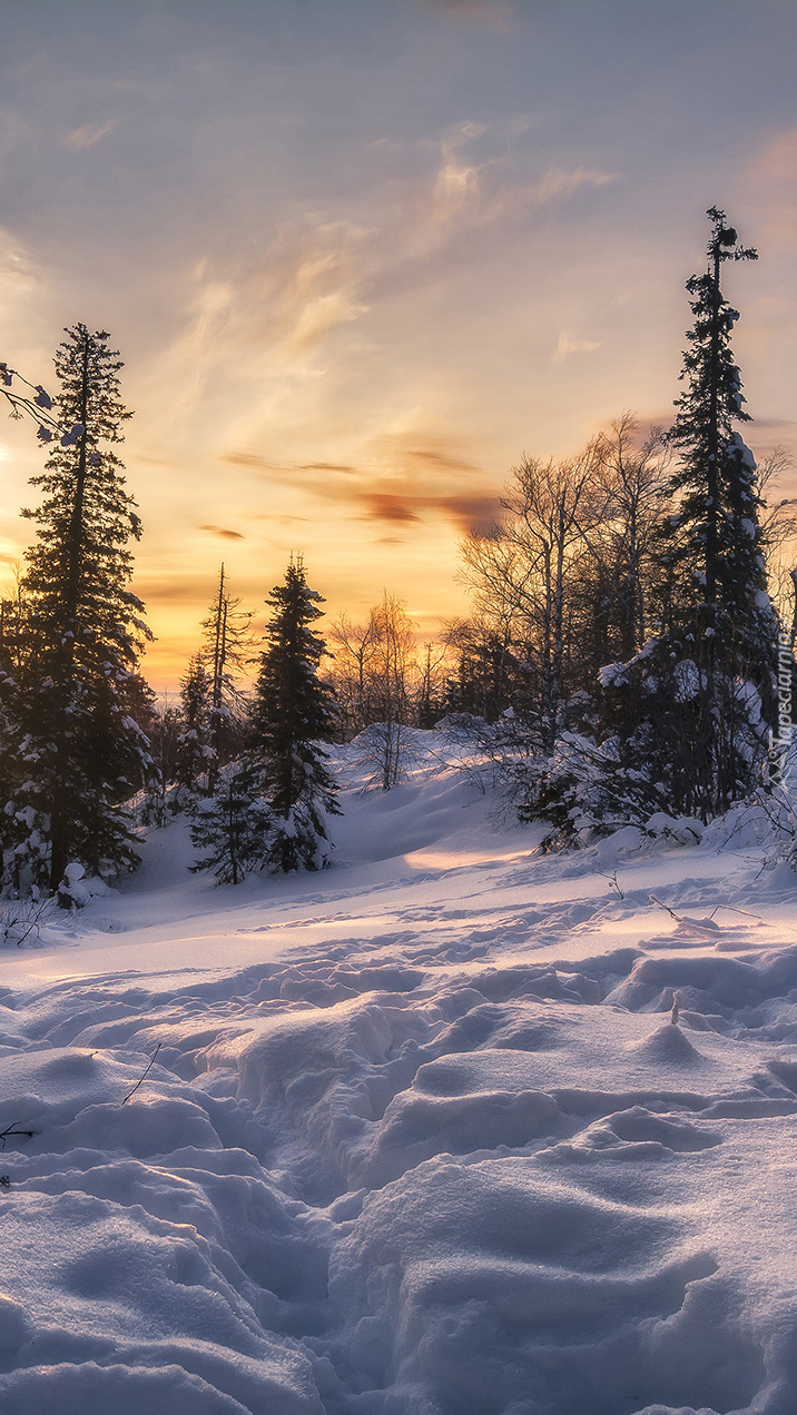 Edytor tapety: Ośnieżone drzewa o wschodzie słońca