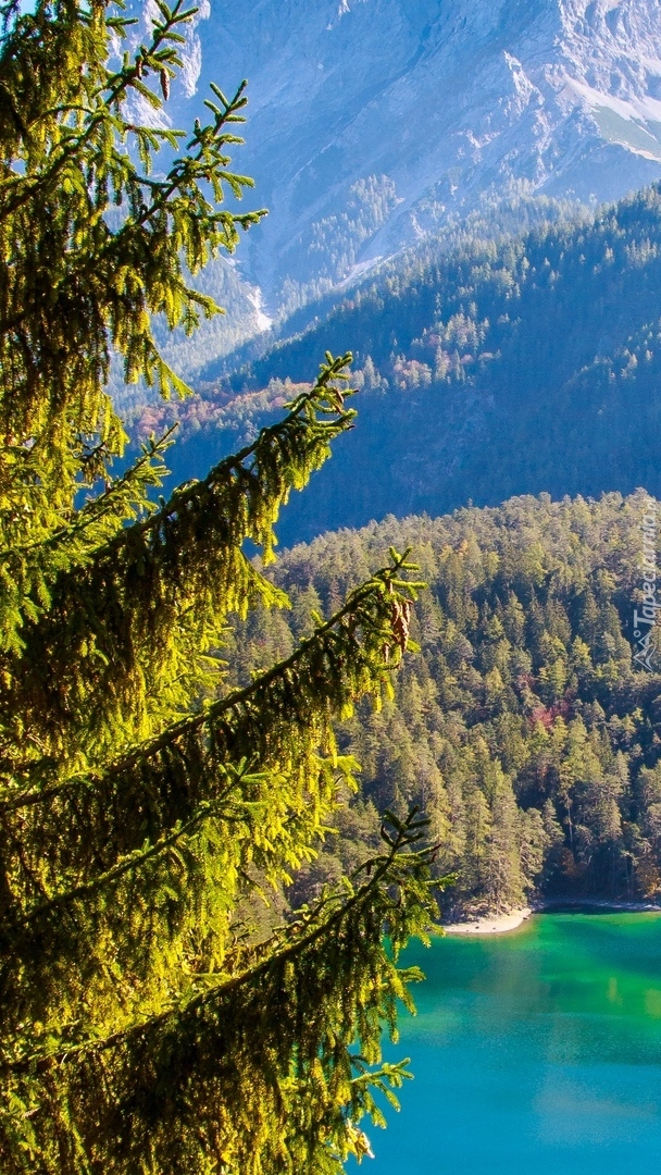 Edytor tapety: Gałęzie drzew z jeziorem w tle