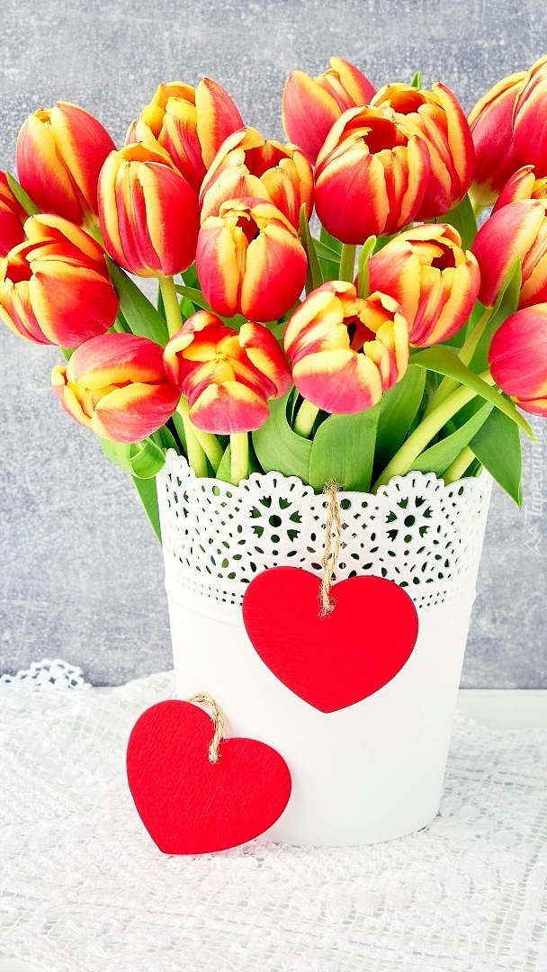 Edytor tapety: Czerwone serca na doniczce z tulipanami