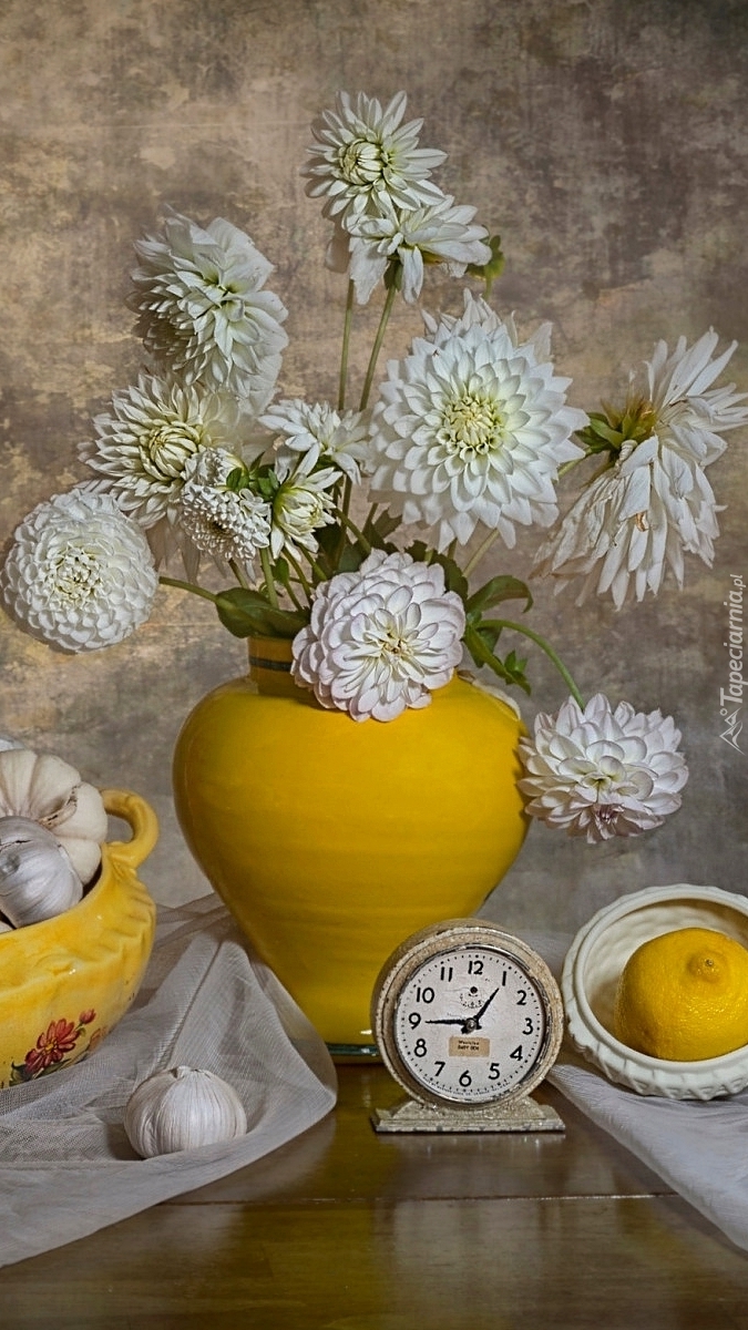 Edytor tapety: Dalie w żółtym wazonie obok budzika