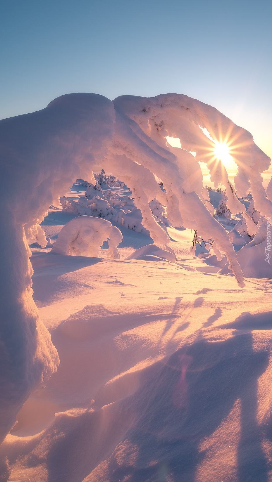 Edytor tapety: Pochylone gałęzie drzew w promieniach słońca