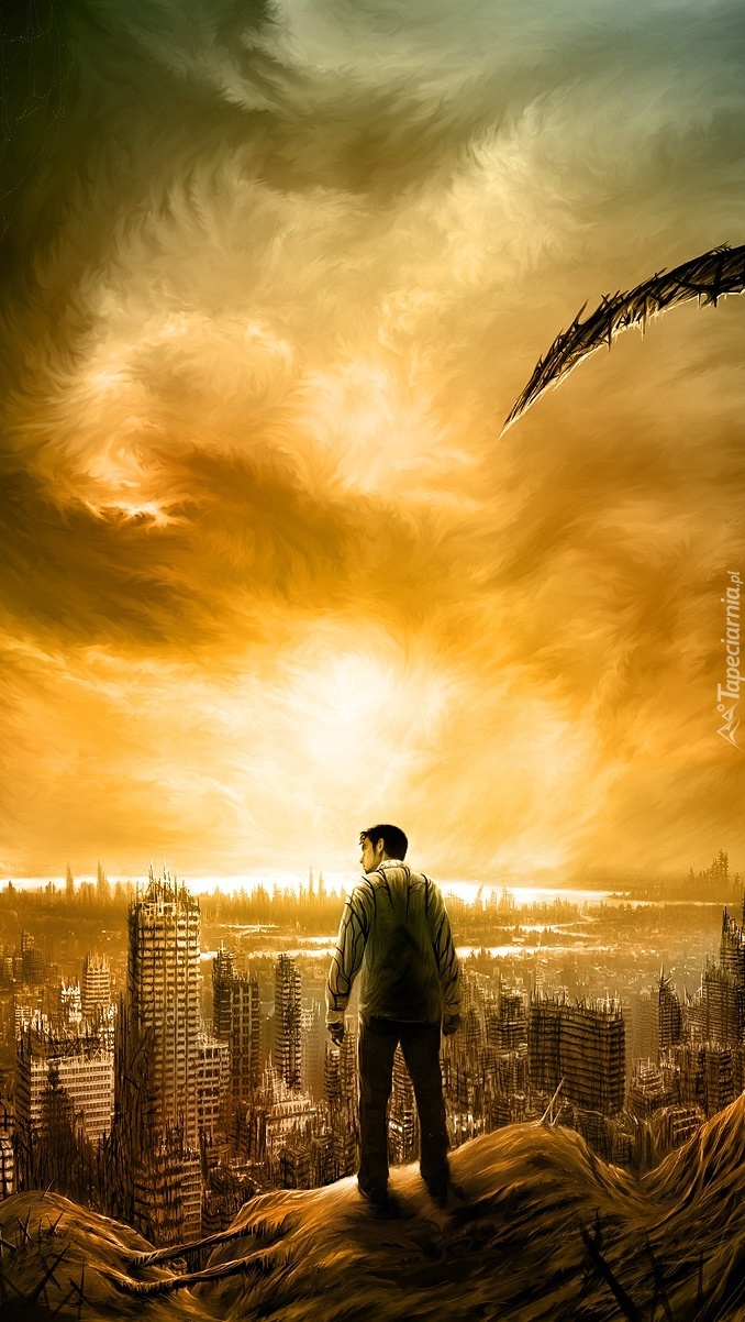 Edytor tapety: Mężczyzna spoglądający na ruiny miasta