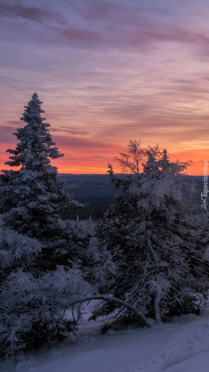 Edytor tapety: Zachód słońca nad ośnieżonymi drzewami