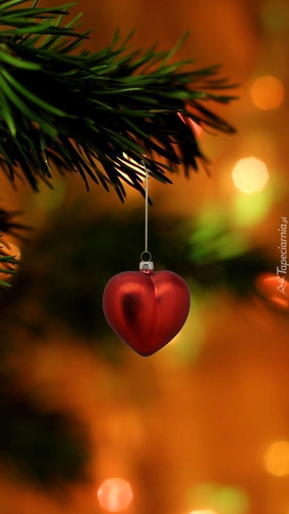 Edytor tapety: Bombkowe serduszko na gałązce choinki