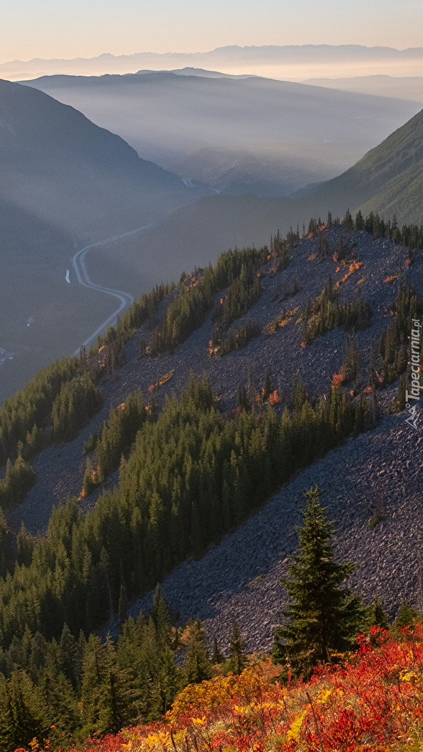 Edytor tapety: Wzgórza zalesione we mgle