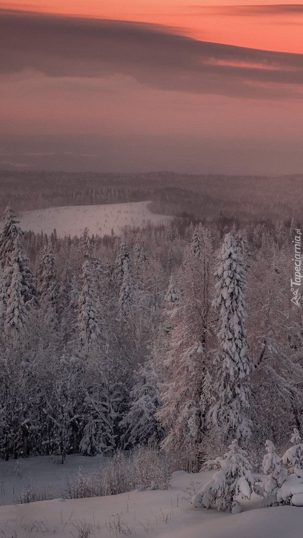 Edytor tapety: Las świerkowy zimą nad jeziorem