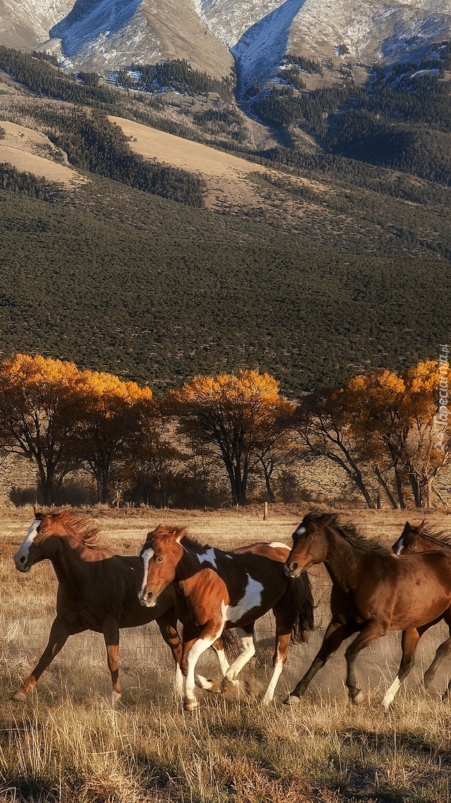 Edytor tapety: Biegnące konie na tle gór