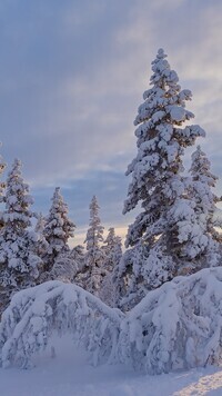 Edytor tapety: Ośnieżone wysokie świerki