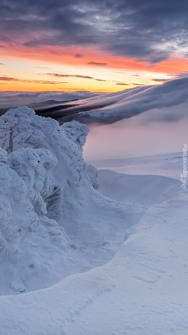 Edytor tapety: Ośnieżone wzgórza o poranku