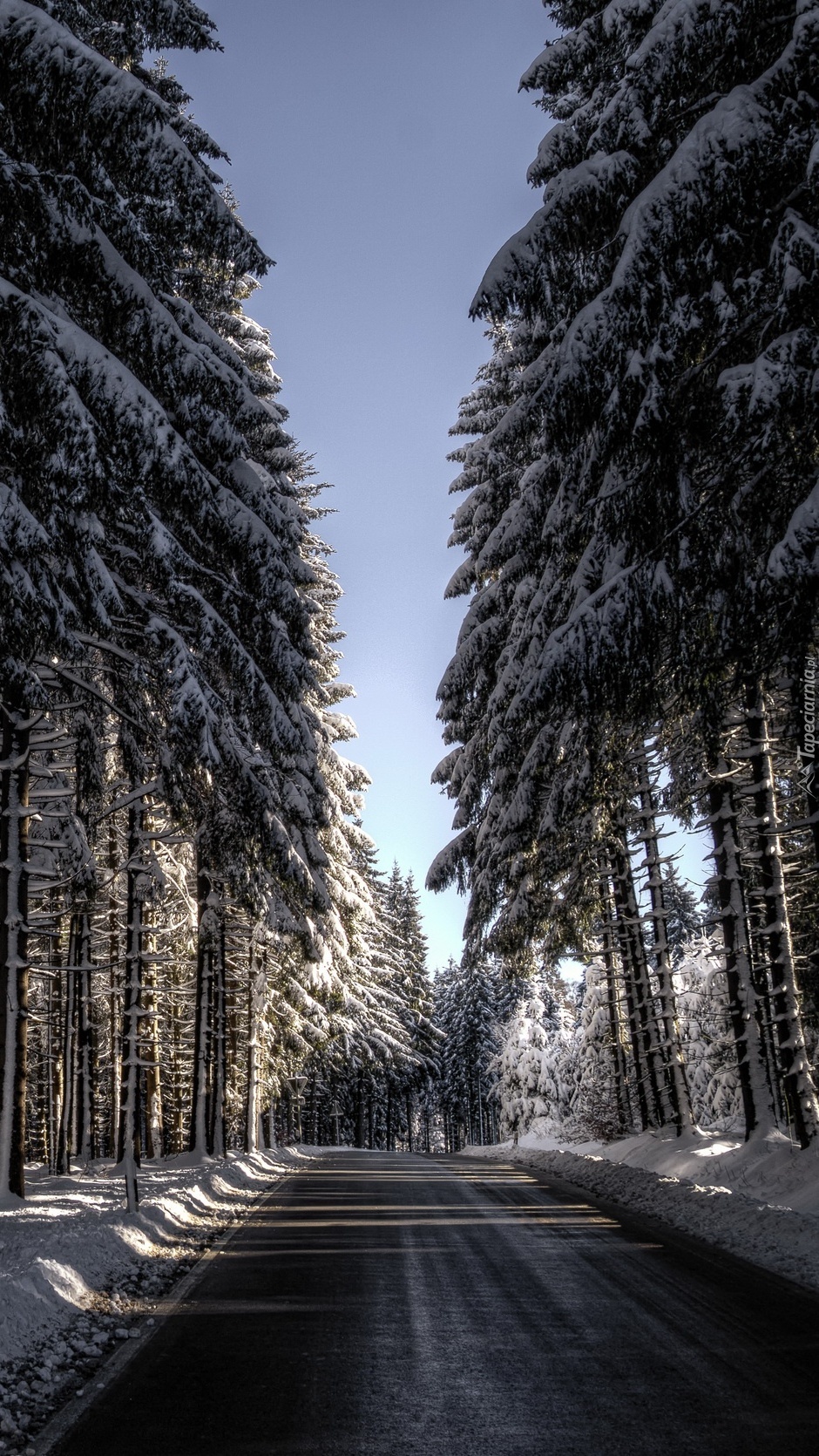 Edytor tapety: Wysokie drzewa przy drodze zimową porą