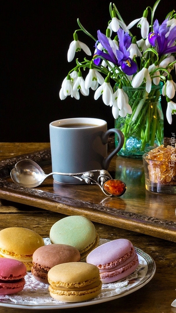 Edytor tapety: Makaroniki i bukiet przebiśniegów z irysami