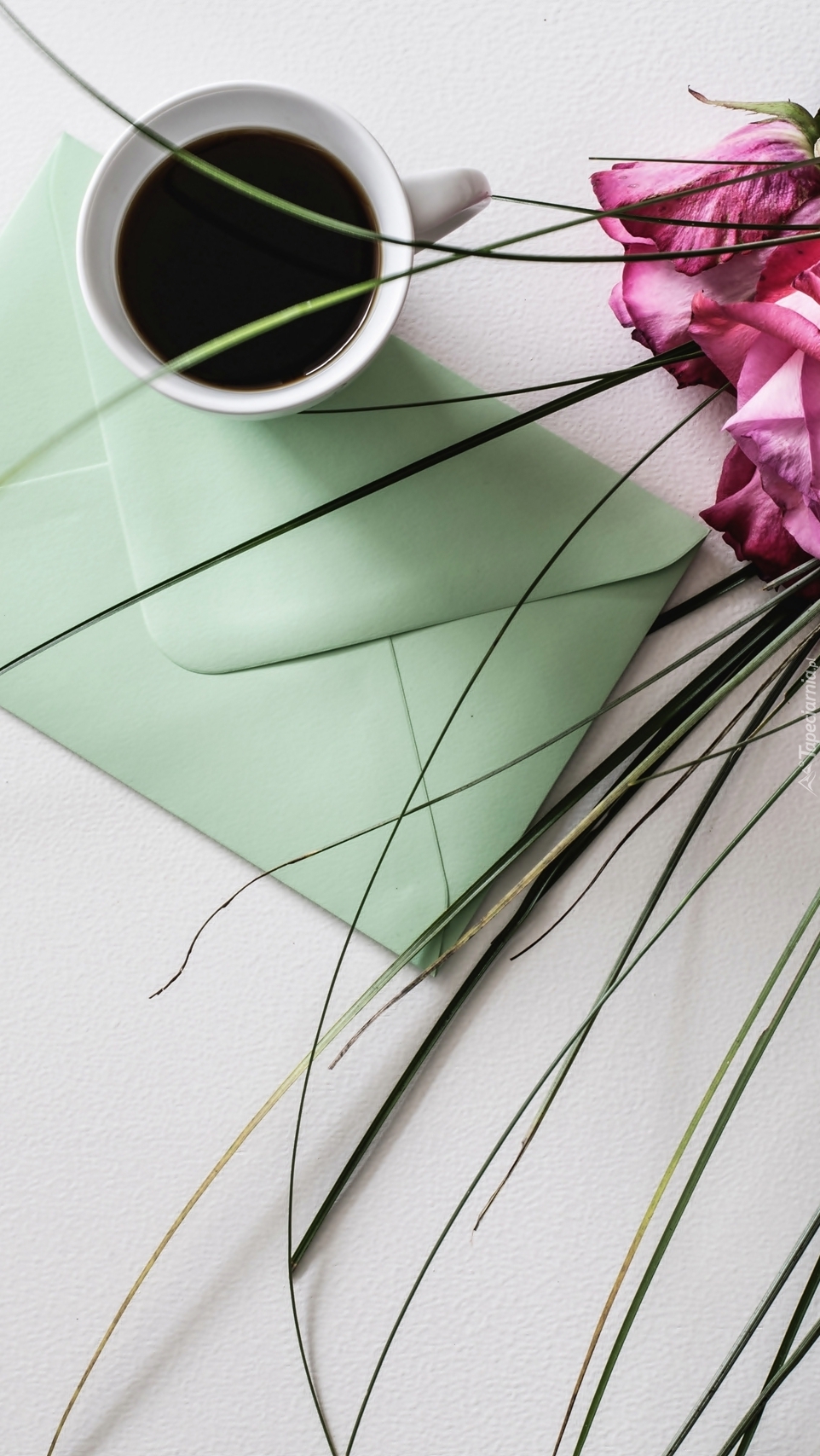 Edytor tapety: Koperta i filiżanka kawy przy różach