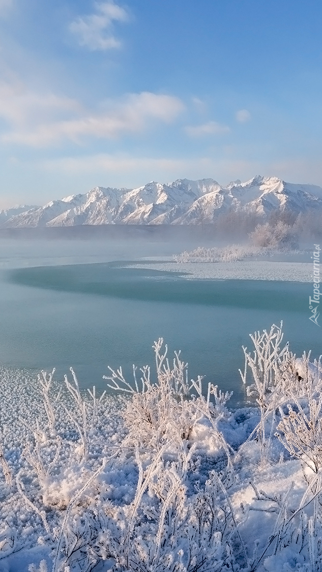 Edytor tapety: Góry i ośnieżone rośliny nad jeziorem