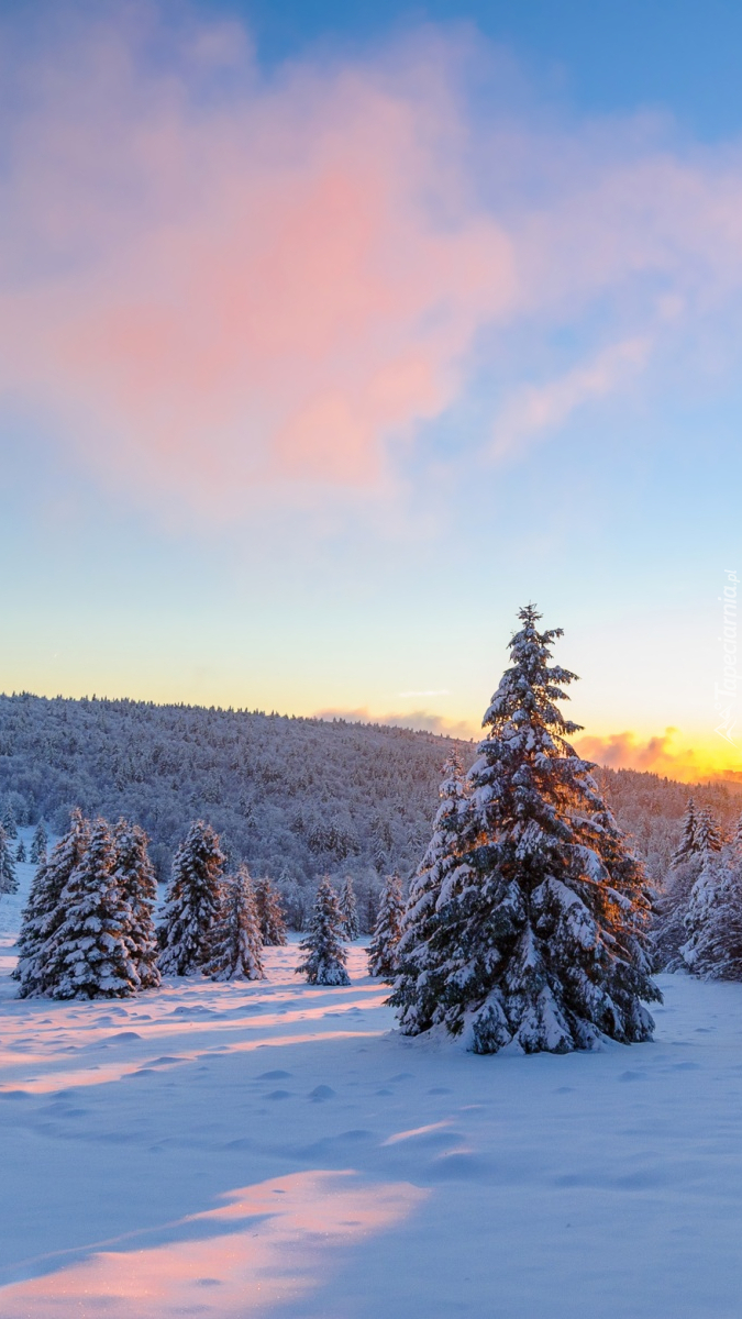 Edytor tapety: Wschód słońca nad ośnieżonym lasem