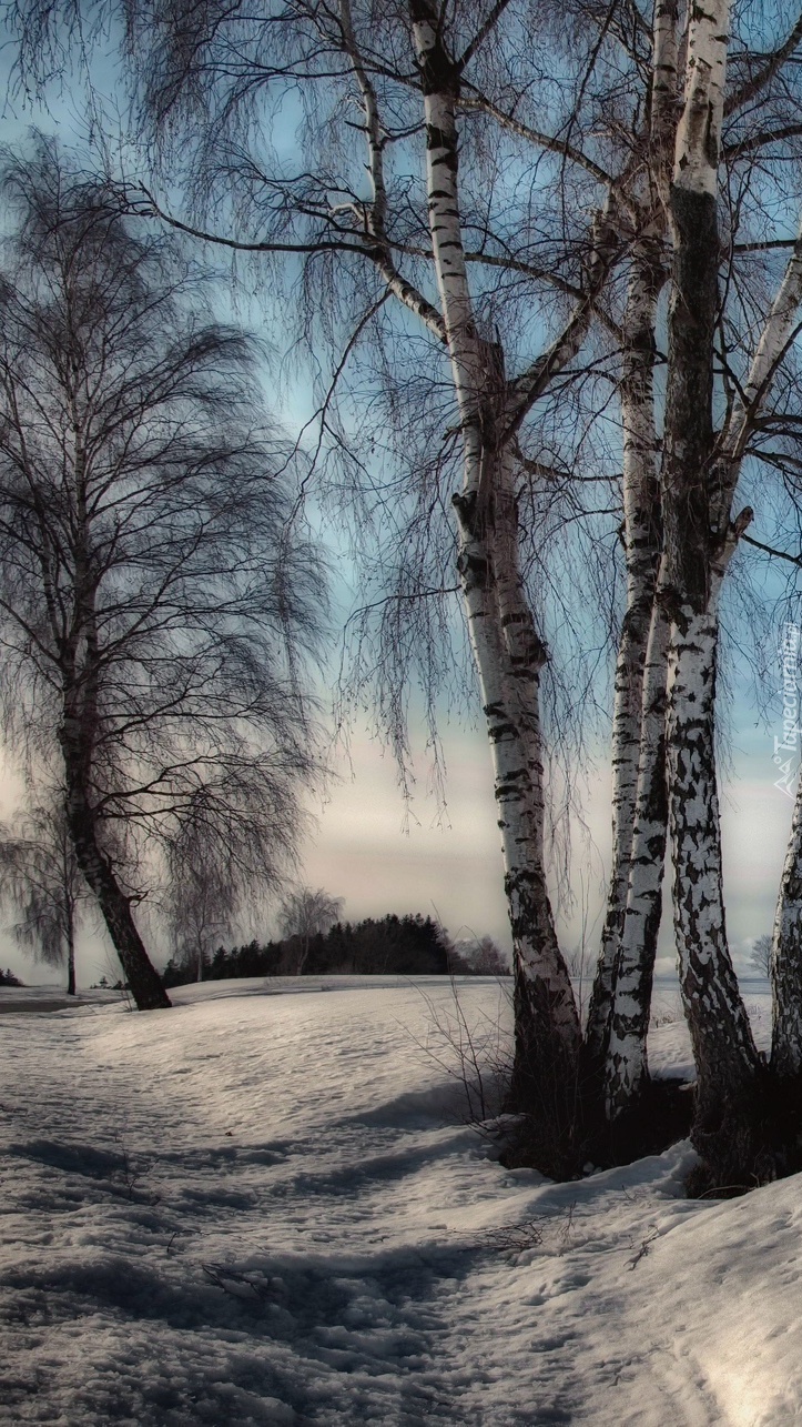Edytor tapety: Brzozy przy zaśnieżonej drodze