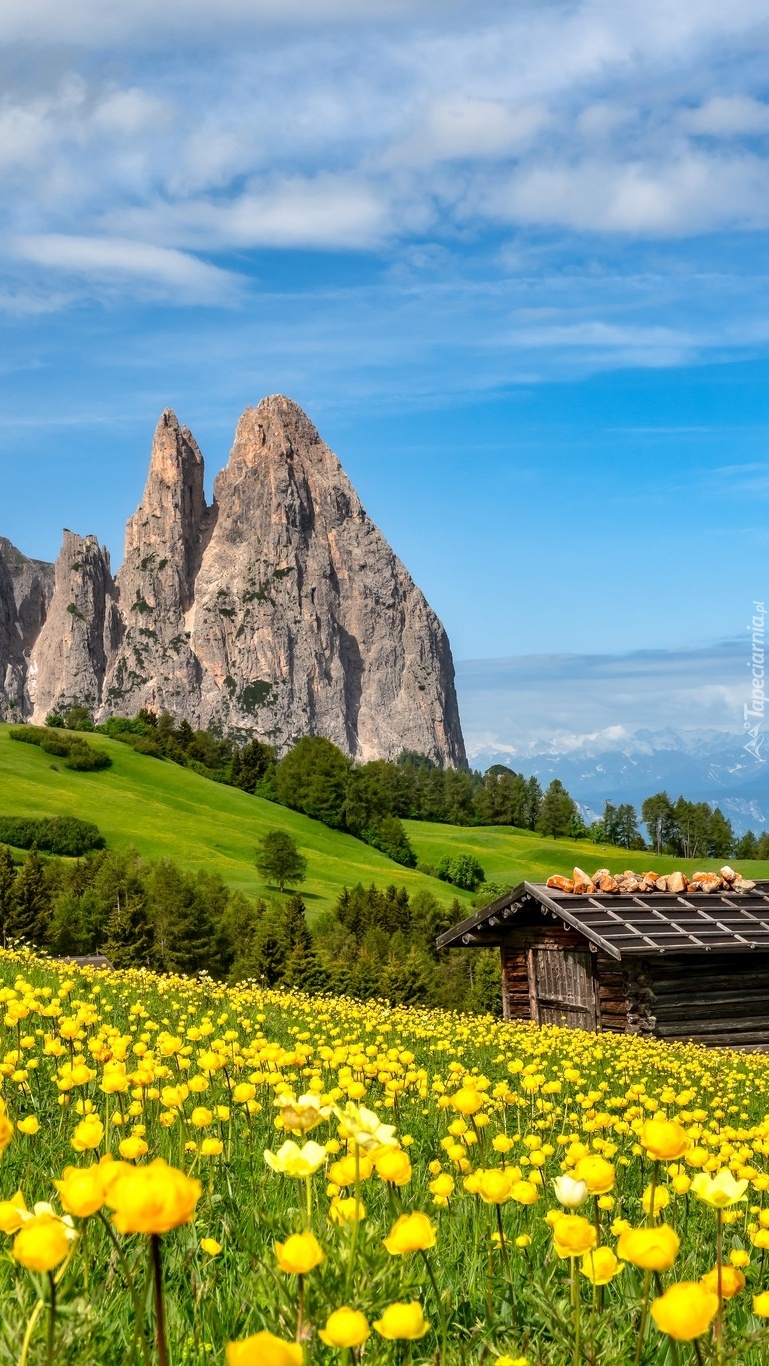 Edytor tapety: Żółte kwiaty na tle Dolomitów