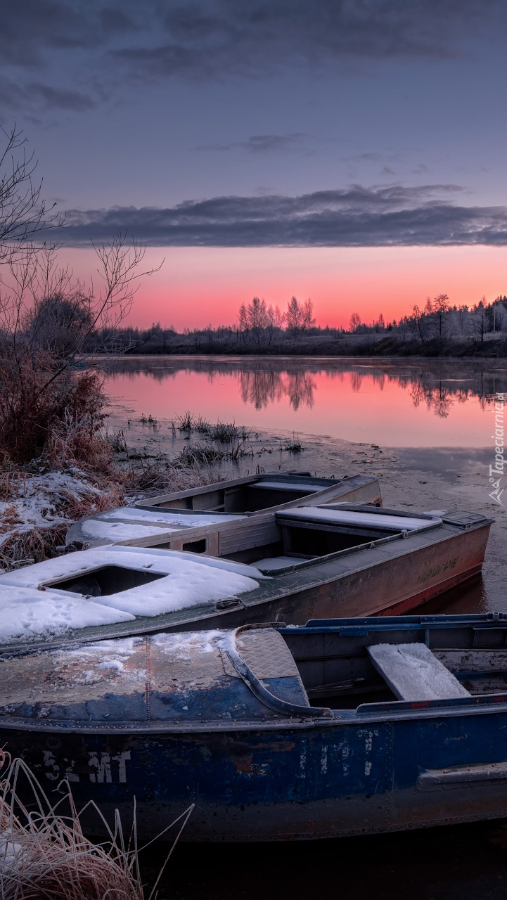 Edytor tapety: Trzy łódki przy brzegu rzeki