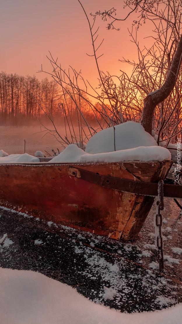 Edytor tapety: Ośnieżona łódka pod drzewem