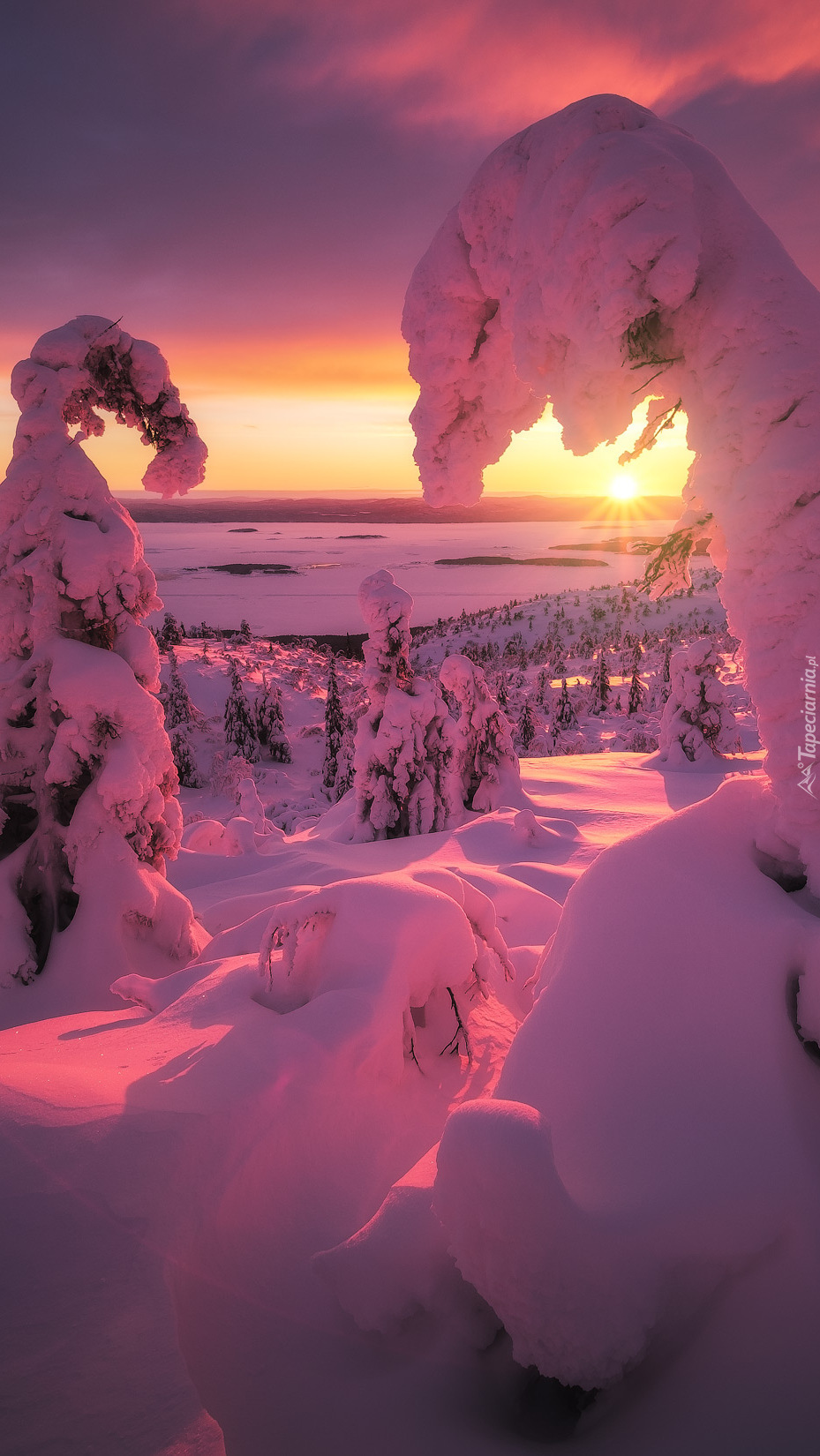 Edytor tapety: Zaśnieżone drzewa na wzgórzu