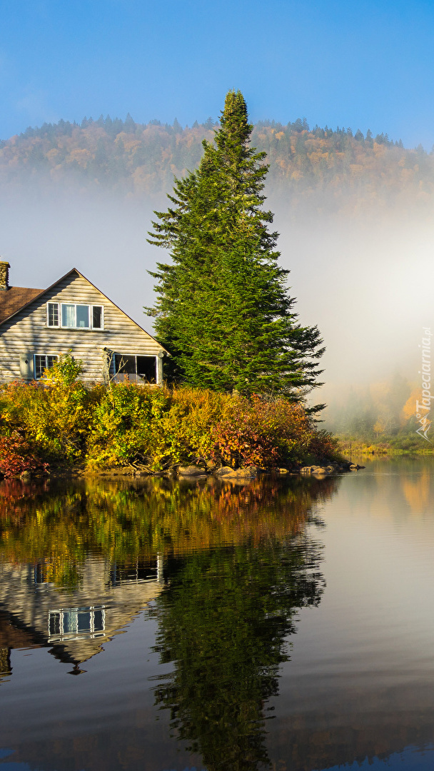 Edytor tapety: Dom przy drzewie nad jeziorem
