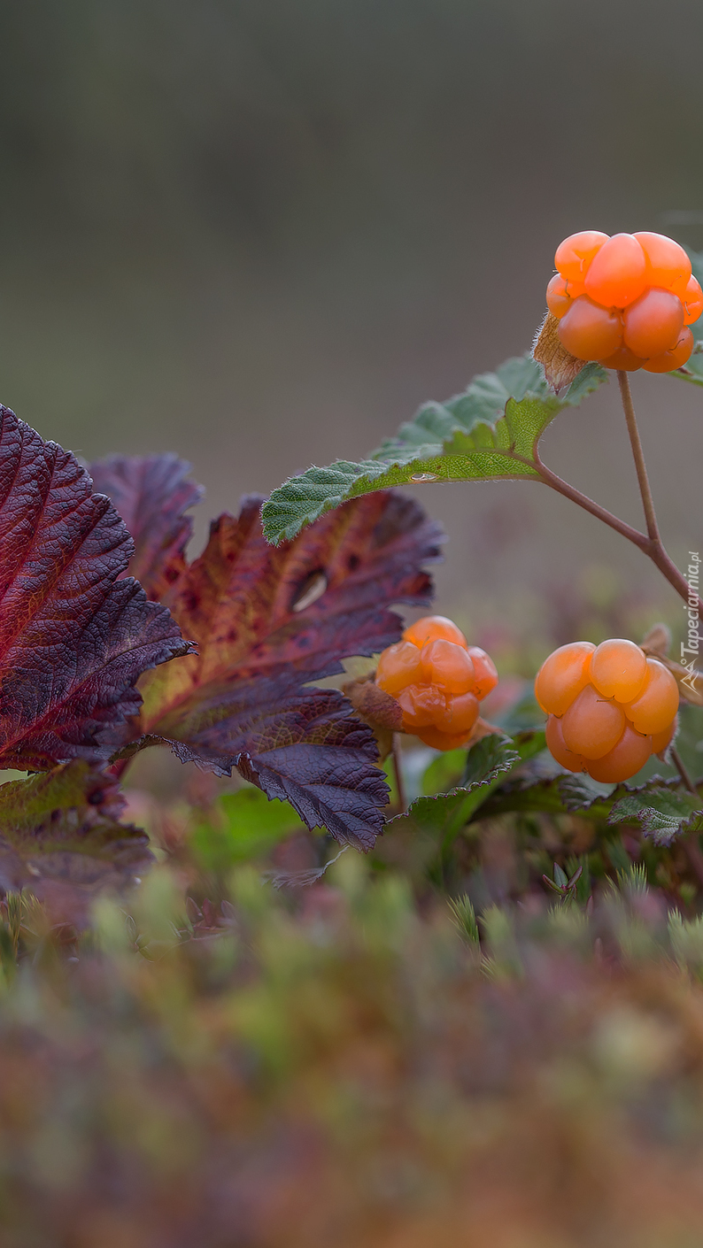 Edytor tapety: Maliny moroszki przy bordowym liściu