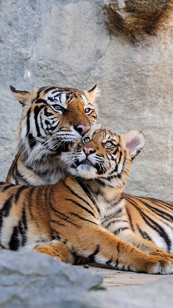 Edytor tapety: Dwa leżące tygrysy na skale
