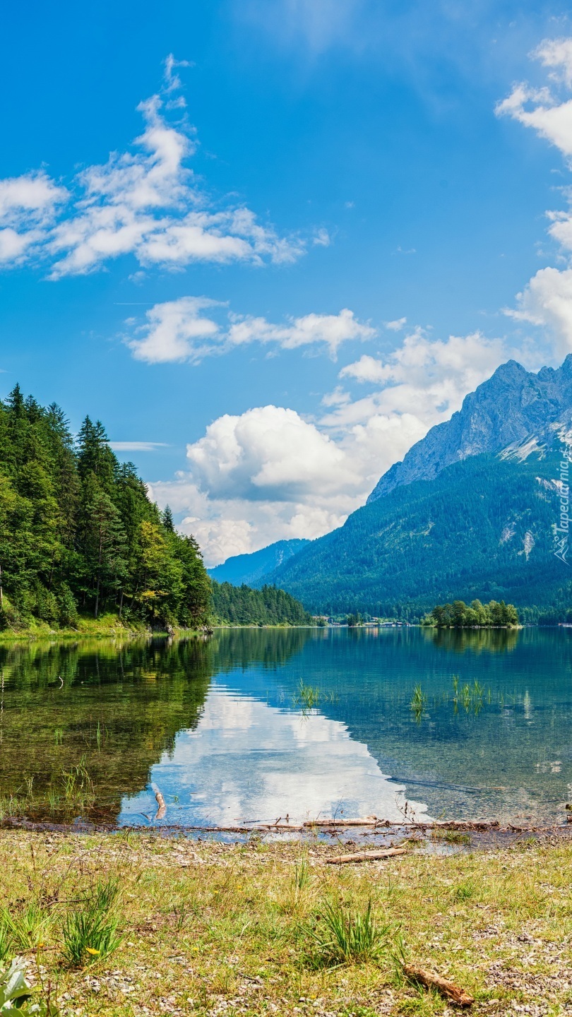 Edytor tapety: Góry i las nad jeziorem