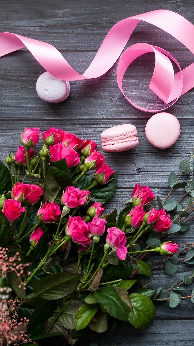 Edytor tapety: Bukiet róż z wstążką i makaronikami