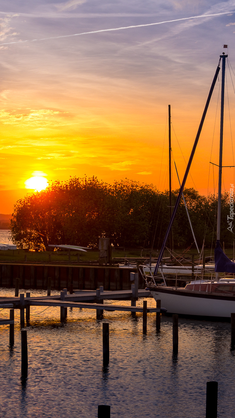 Edytor tapety: Żaglówki na przystani o zachodzie słońca