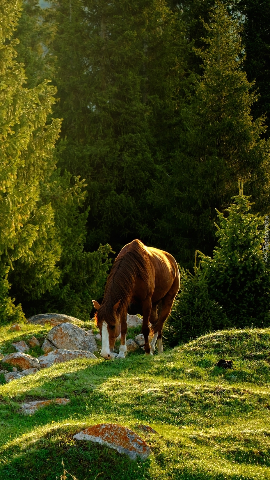 Edytor tapety: Koń na pastwisku pod lasem