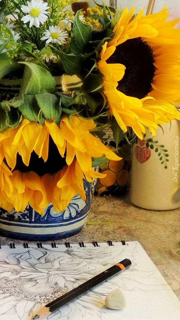 Edytor tapety: Słoneczniki w wazonie i naszkicowany rysunek