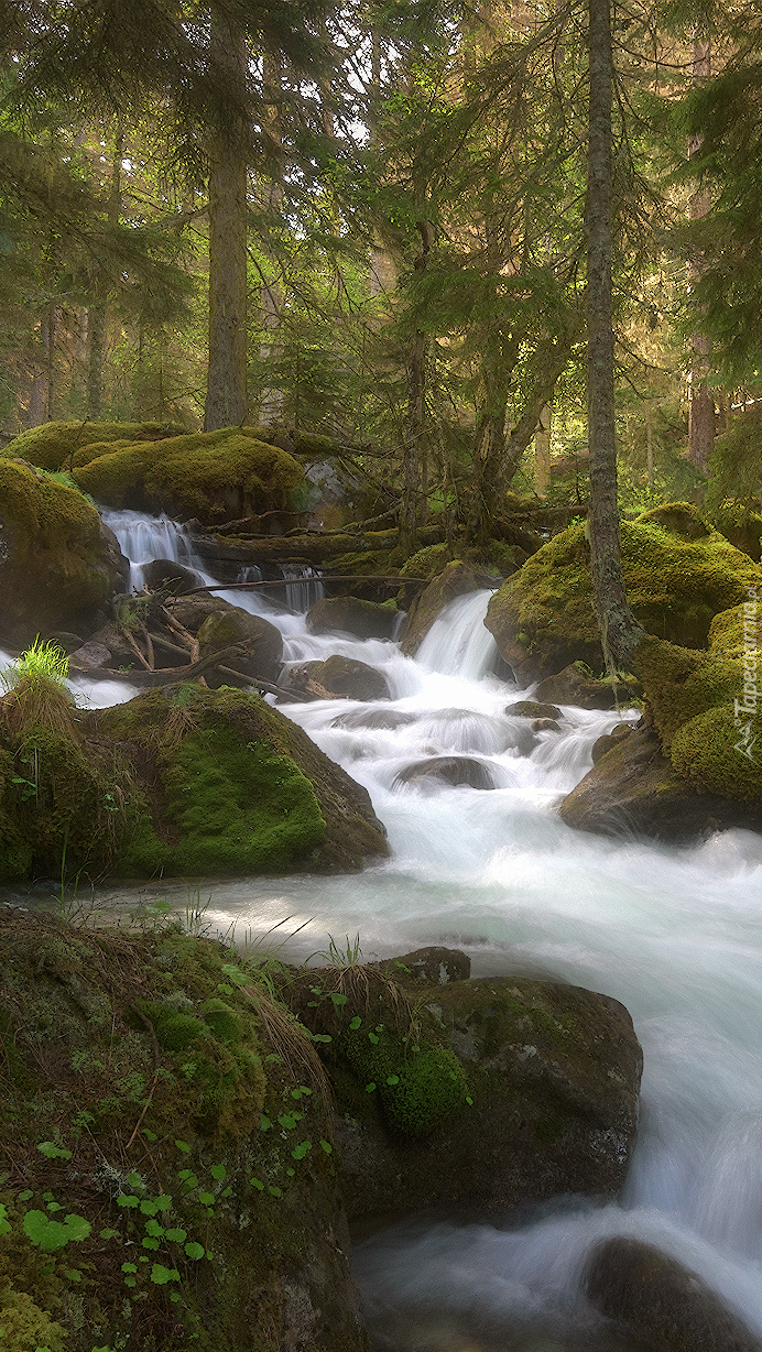 Edytor tapety: Strumyk i omszałe kamienie w lesie