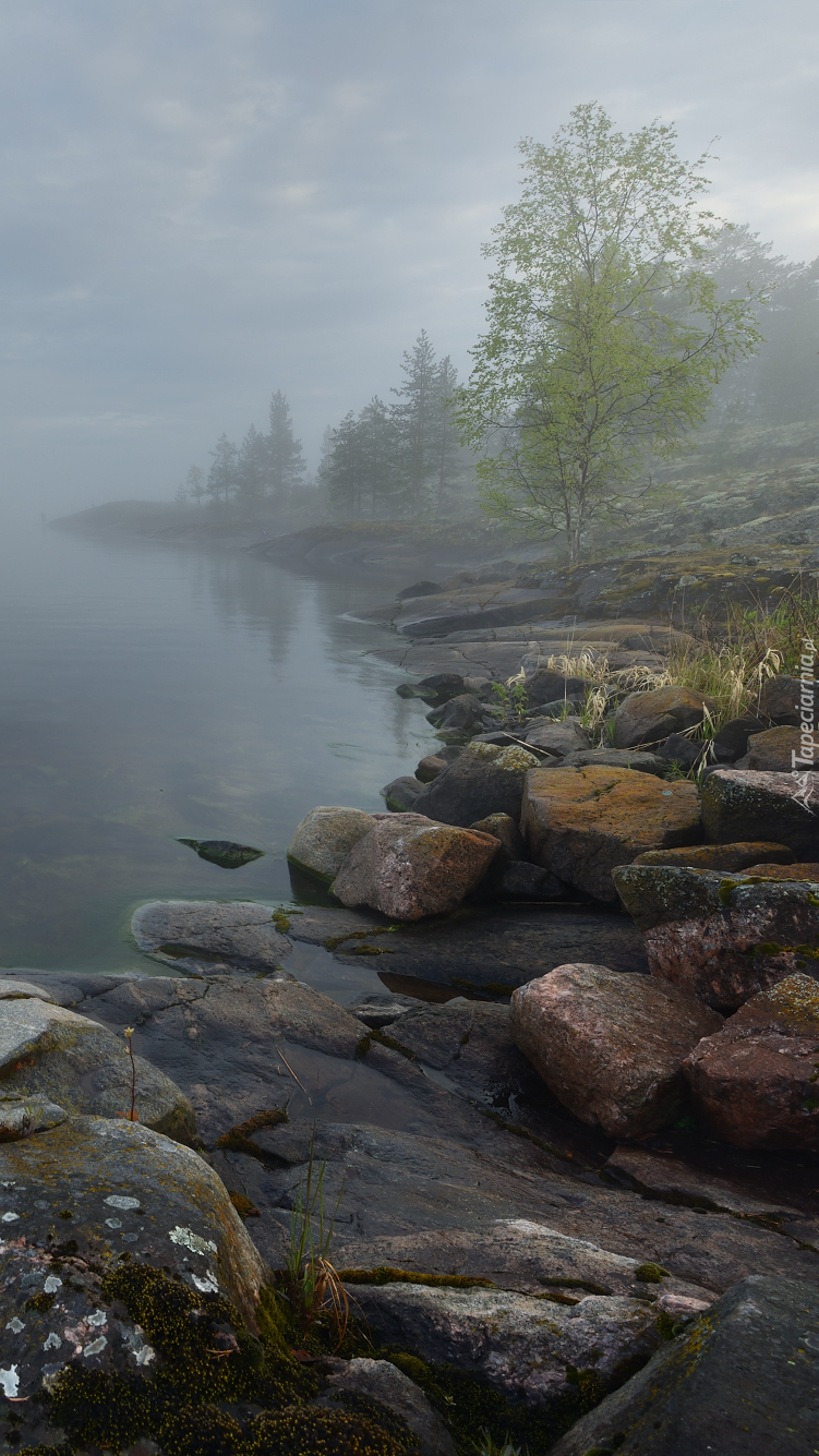 Edytor tapety: Kamienie na brzegu jeziora we mgle