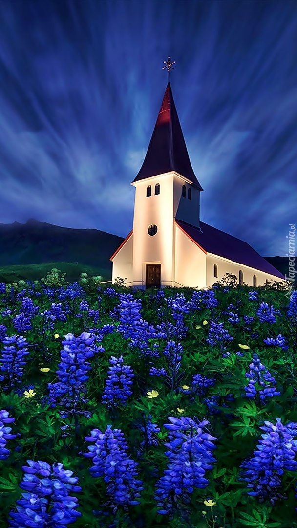 Edytor tapety: Kościółek w osłonie kwitnących hiacyntów