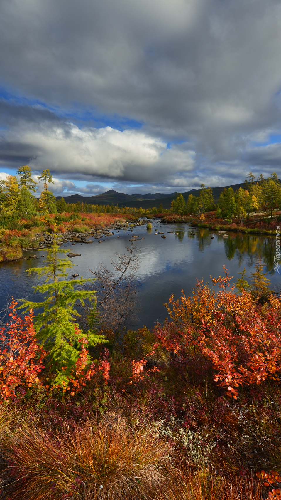 Edytor tapety: Drzewa i kolorowe krzewy nad rzeką